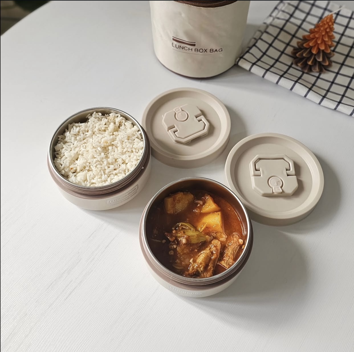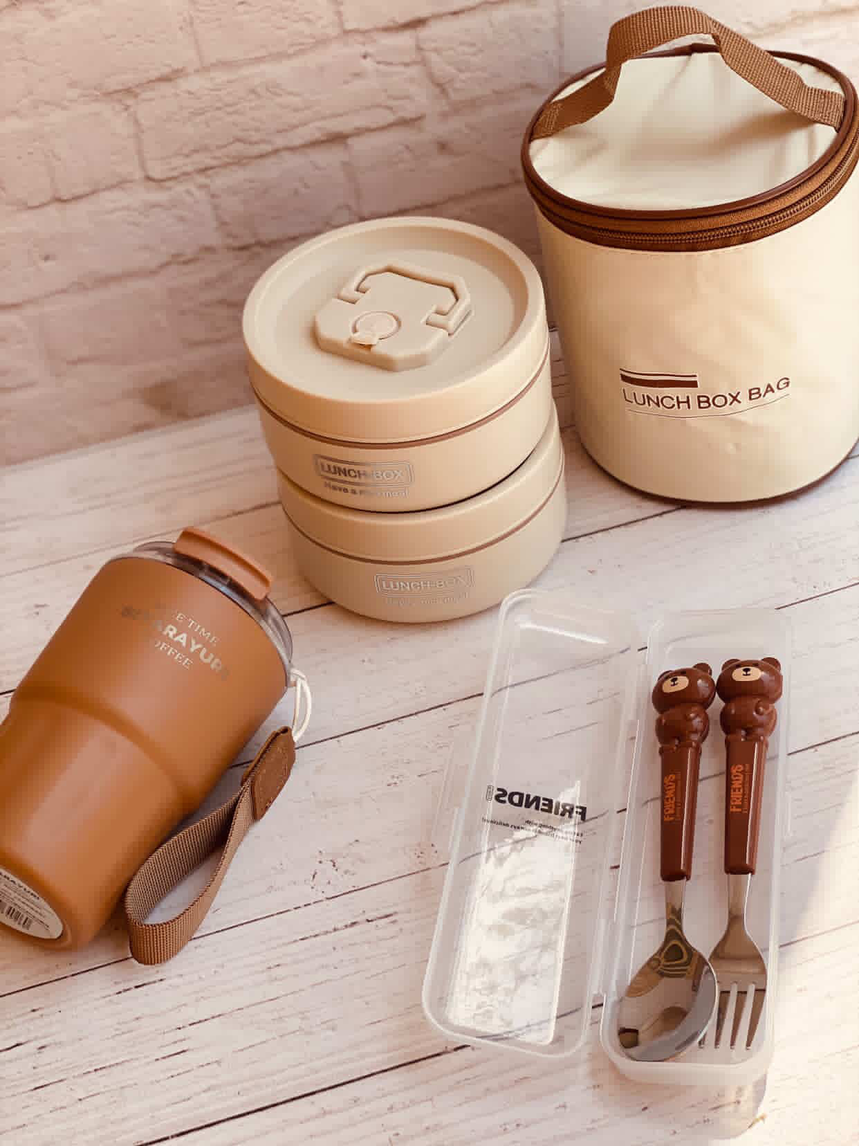 لانچ باکس(ظرف غذا)دوطبقه همراه کیف رنگ کرم
